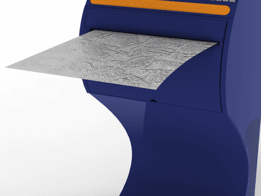 Output is thermofoamed sheet that has a tactile surface to identify what is made on it. Paper is cut from the roller according to set dimension.