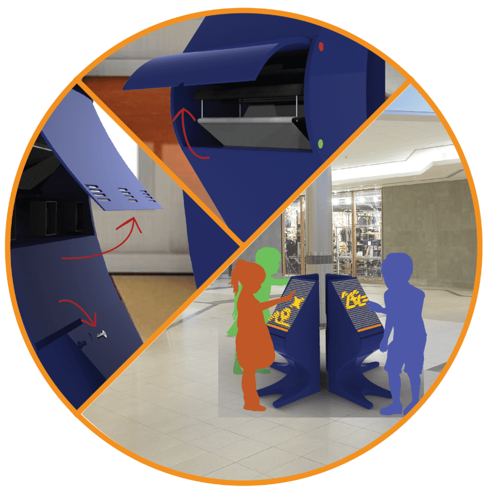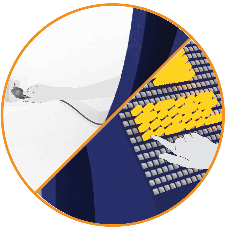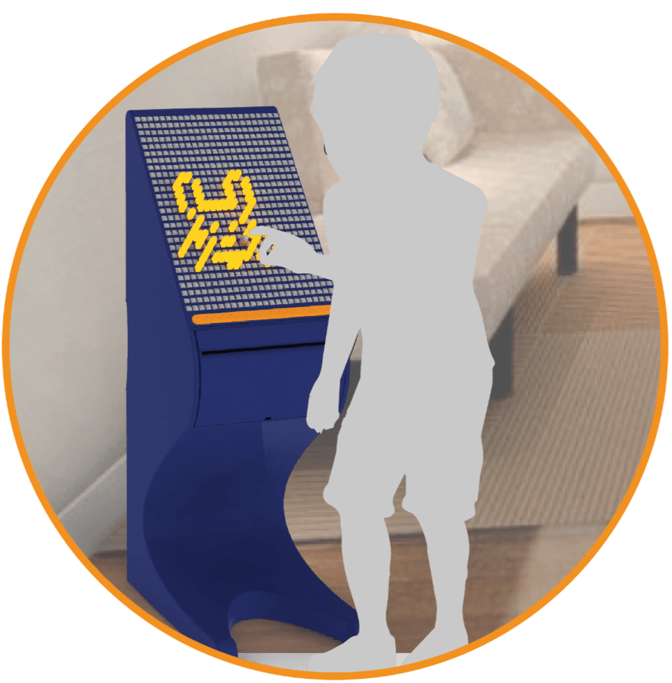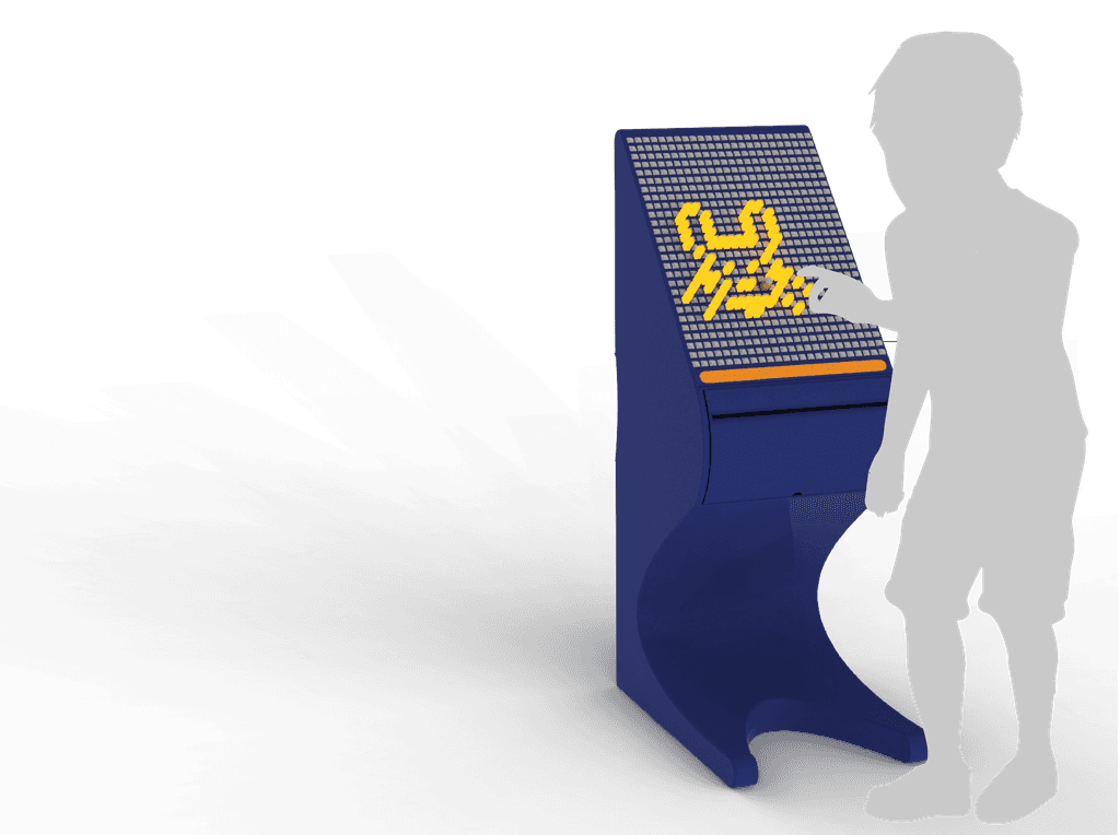Plugged in to power to operate Artact. User clicks retractable pixel to make it active. The pixel stands out and lights up, click sound is also produced due to mechanical movement.