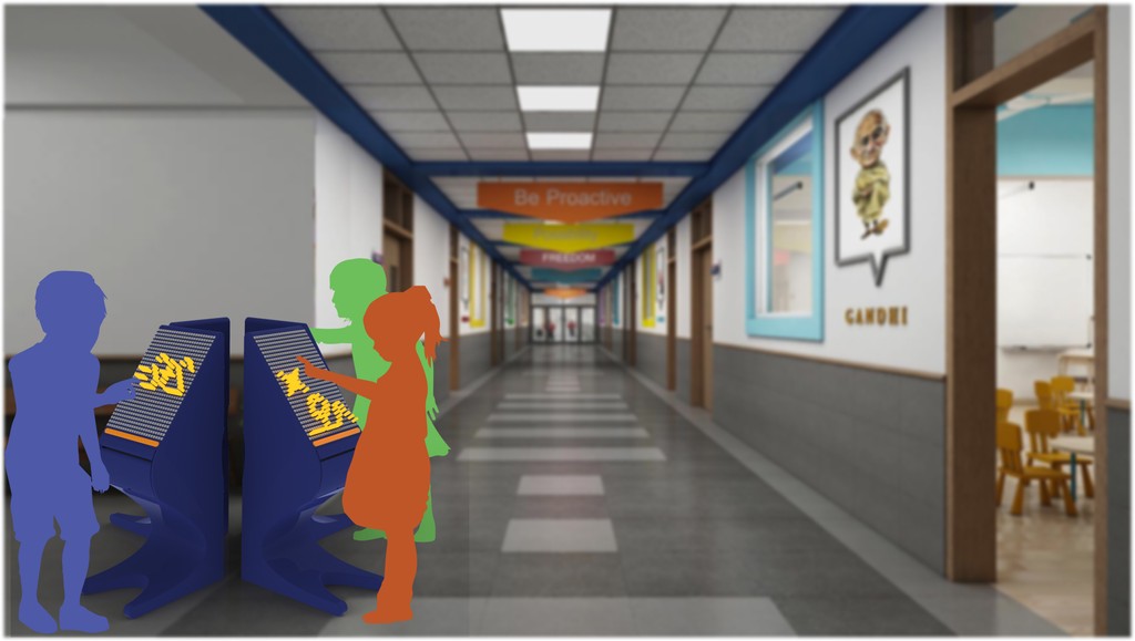 Design a solution that allows visual communication to be tangible in order to enhance development and understanding for partially sighted children who fall behind during formal operational stage, through interactive surfaces and tactile feedbacks whilst creating ground for socializing with sighted peers.