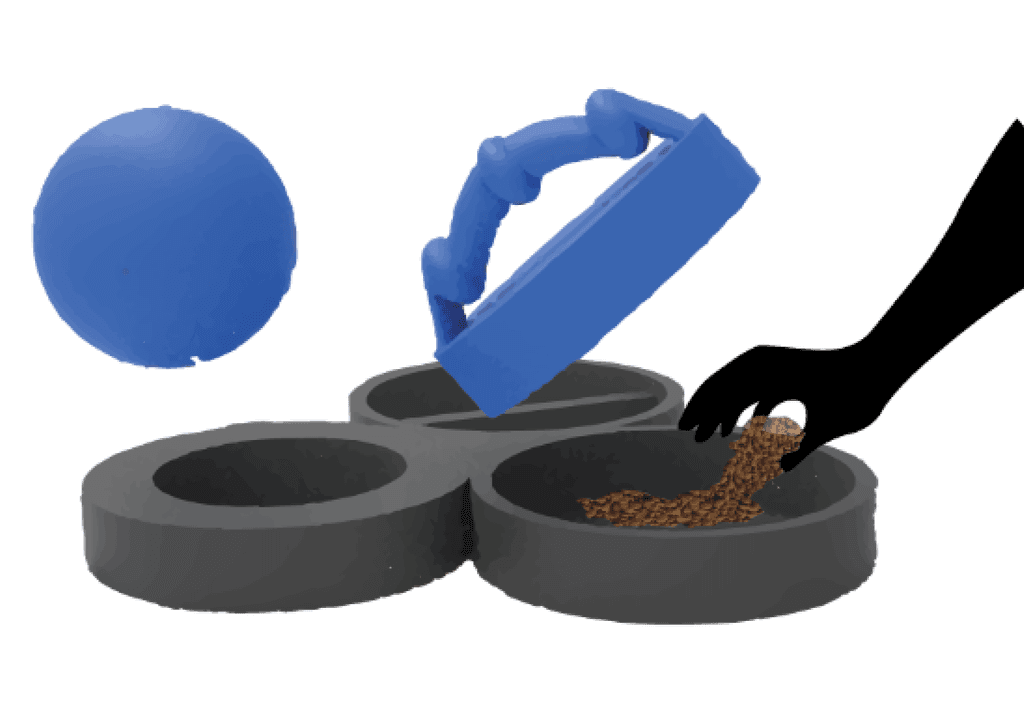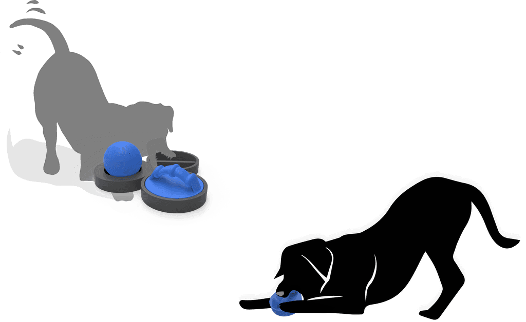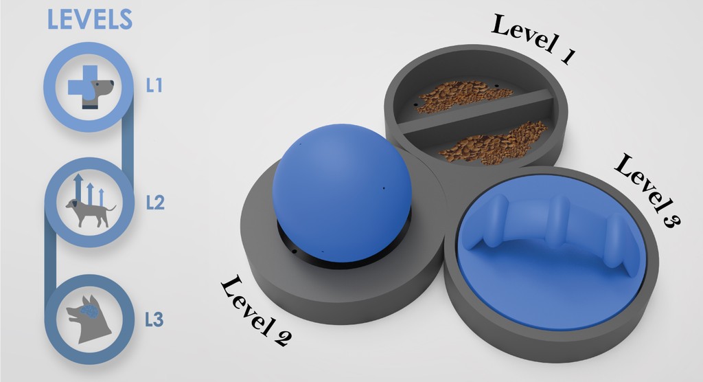 Dog begins engagement with Level 2 The rubber ball is removed from the top of the level and food is unlocked. The ball releases lavender scent to help release stress.