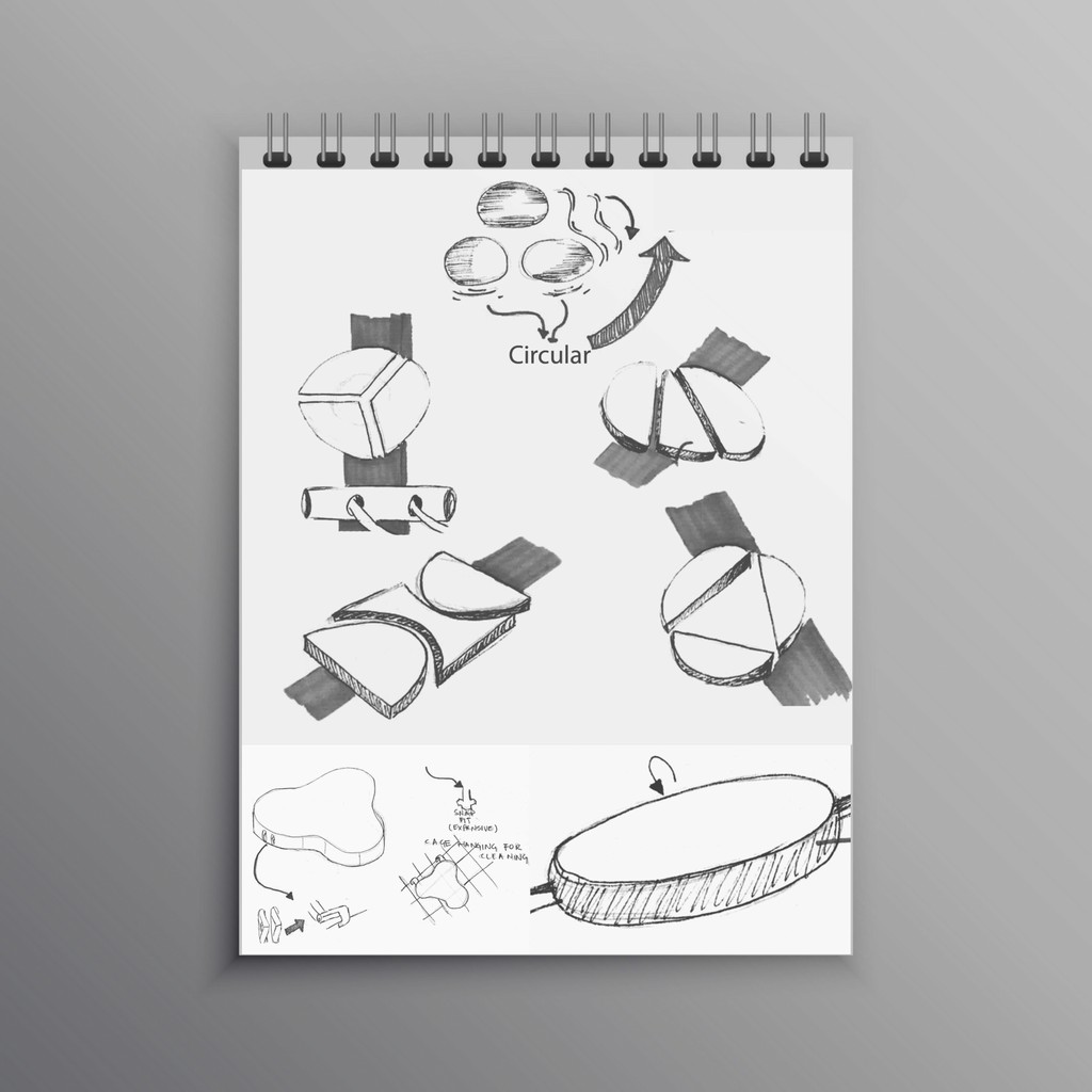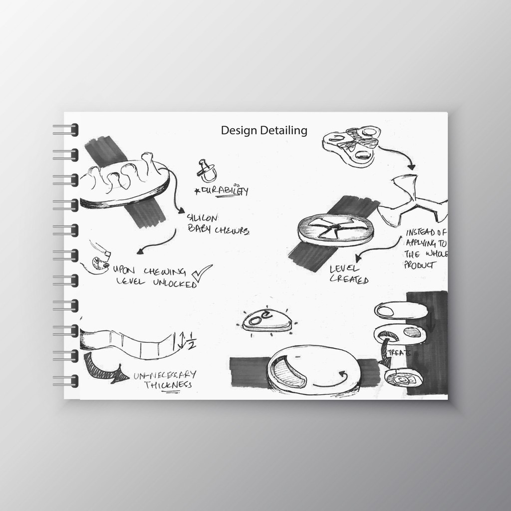 Design iterations based on testing feedbacks, from cardboard prototypes, depending on success of different product features and functionality.