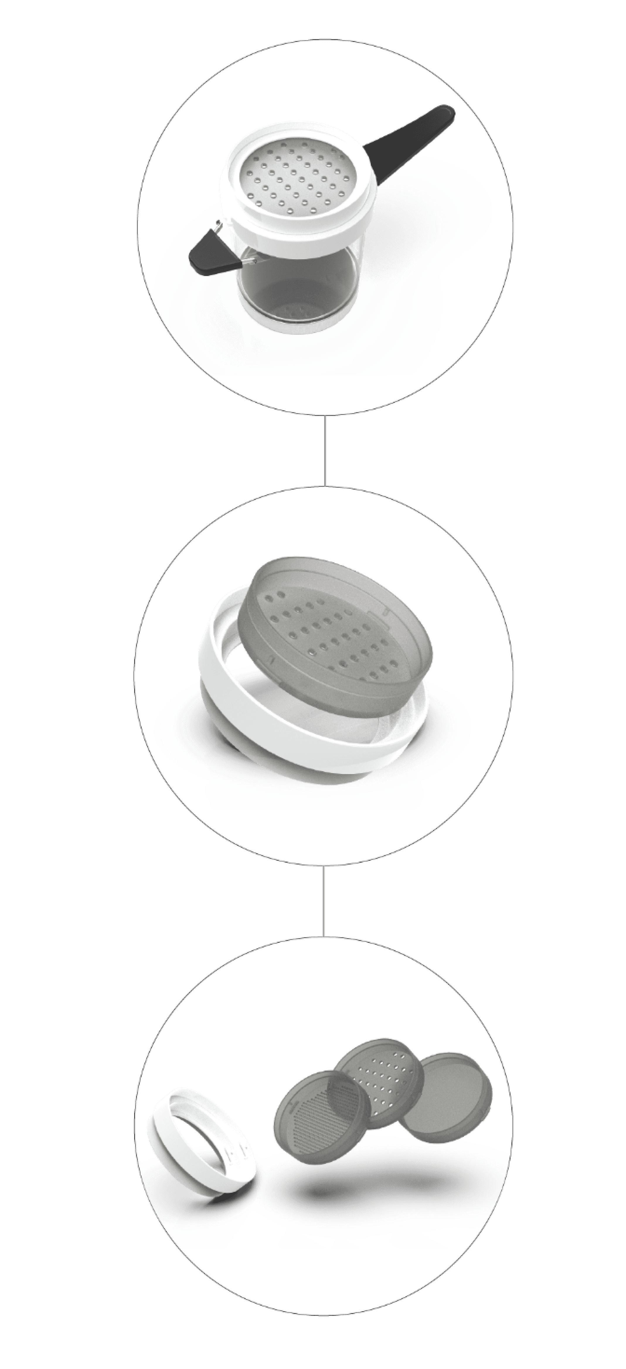 Tea making: User places the preferred mesh on the bottom side of the cap using click and lock mechanism. Cap is then tightened to the cooking cup