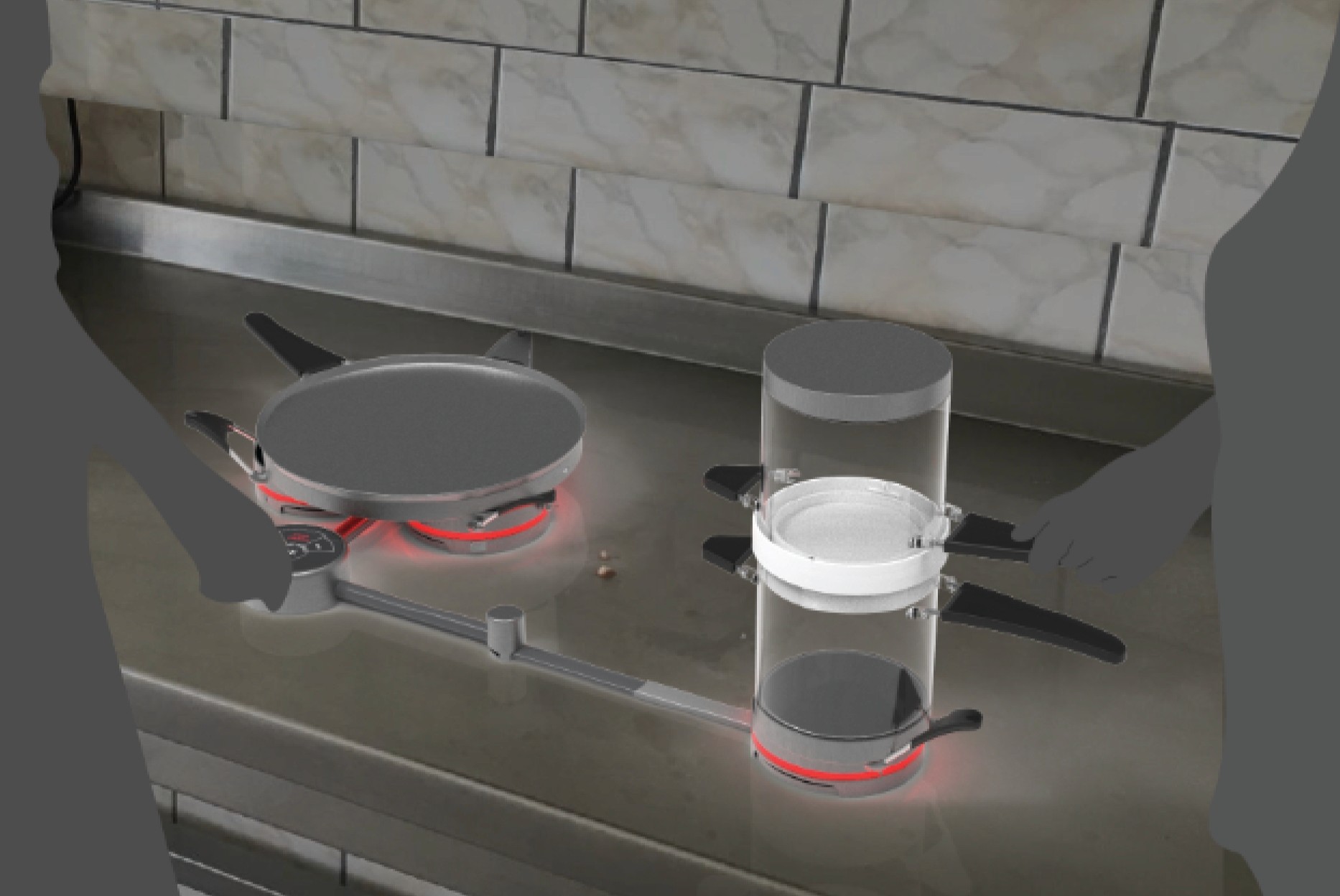 Design a solution that allows users to cook multiple meals using same utensils. Moreover, a design that helps more than one user to use at one time while still incorporating both big pots/pans and small utensils.