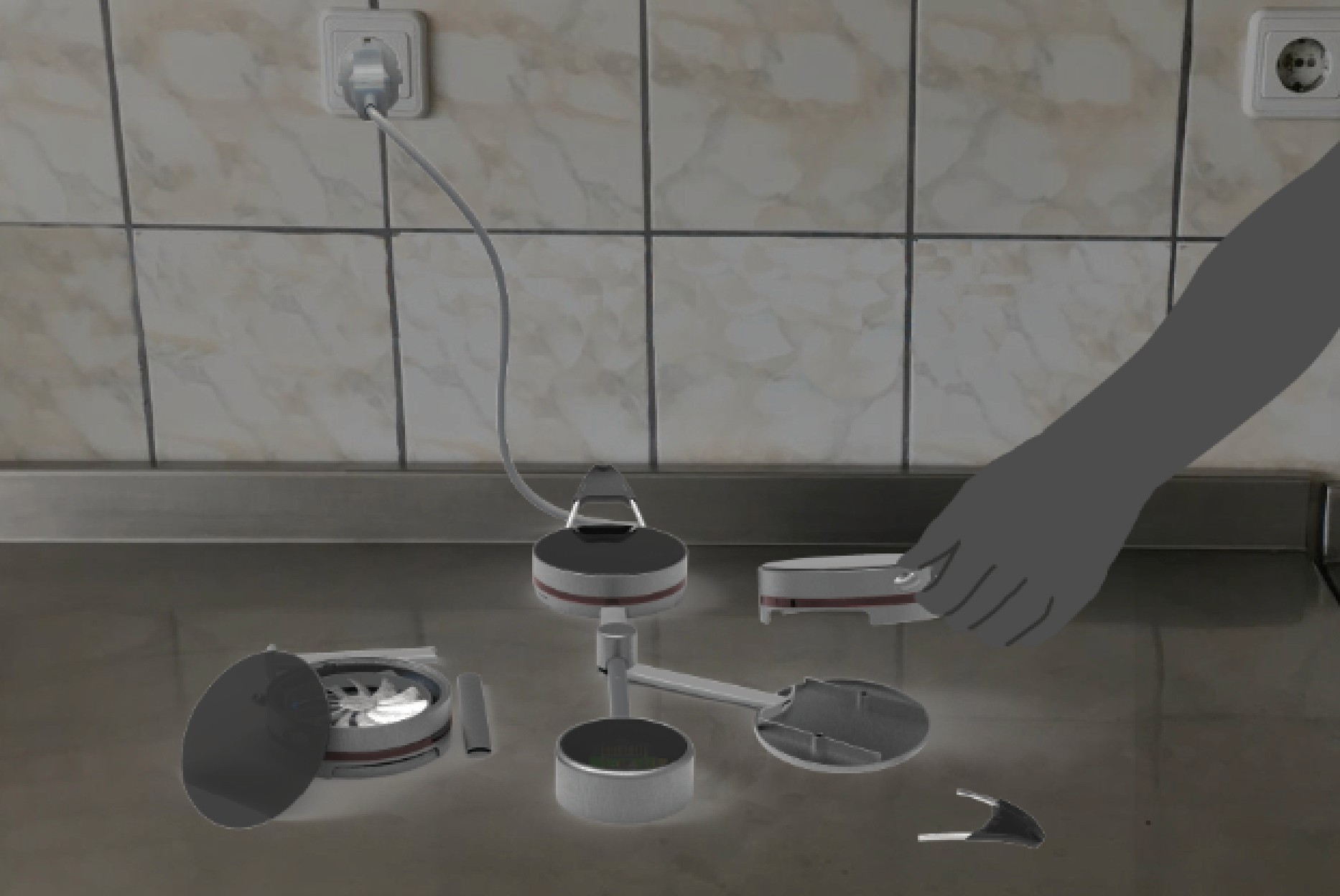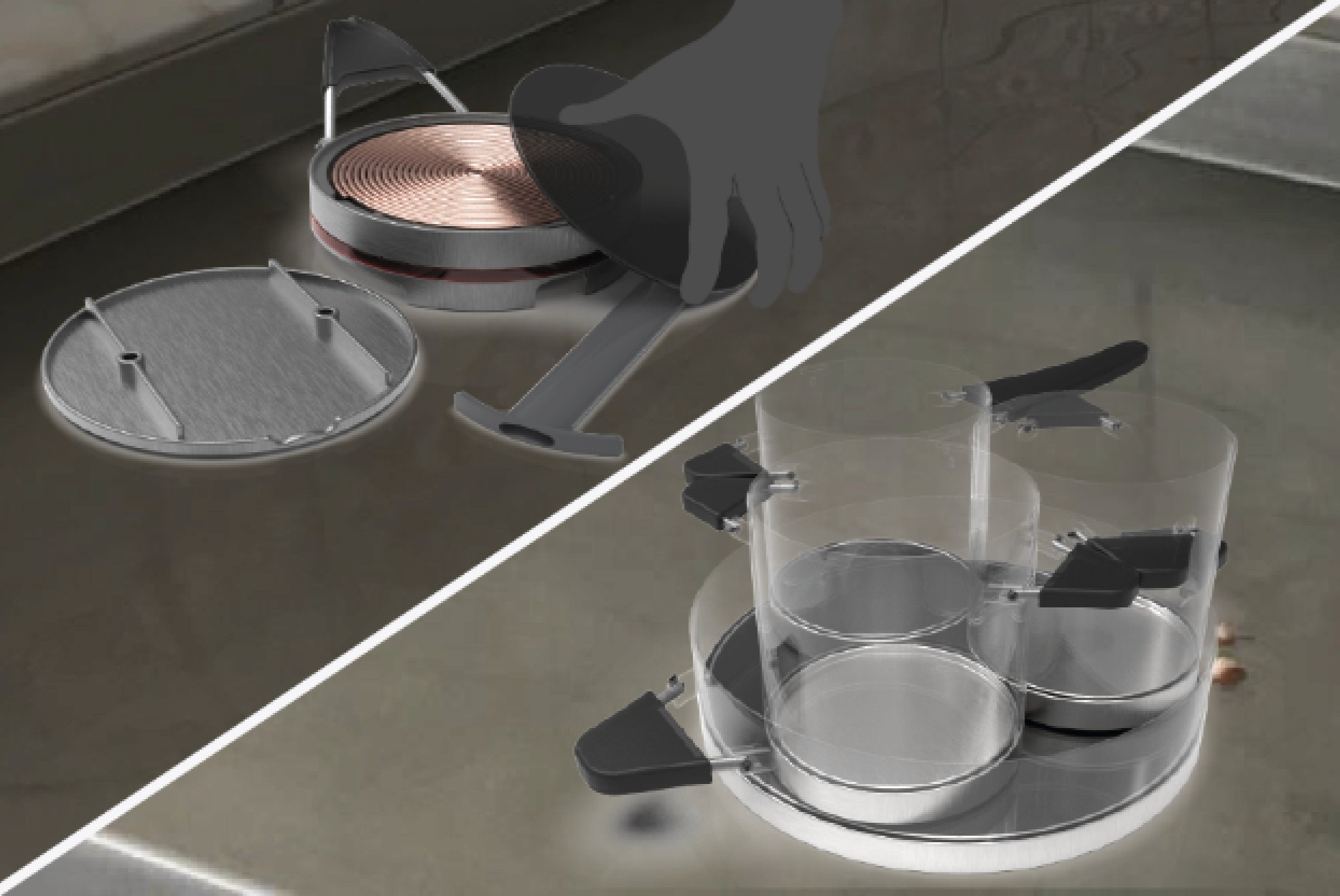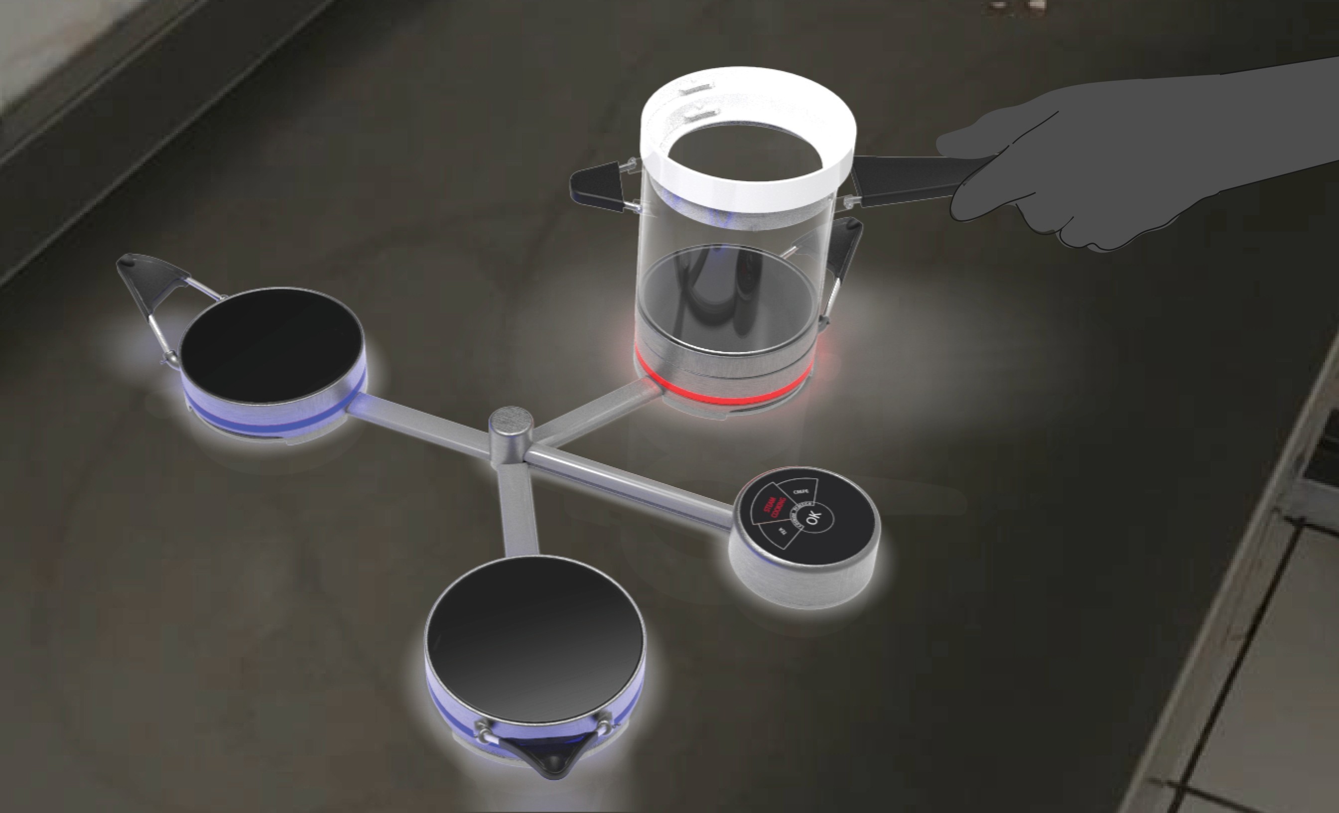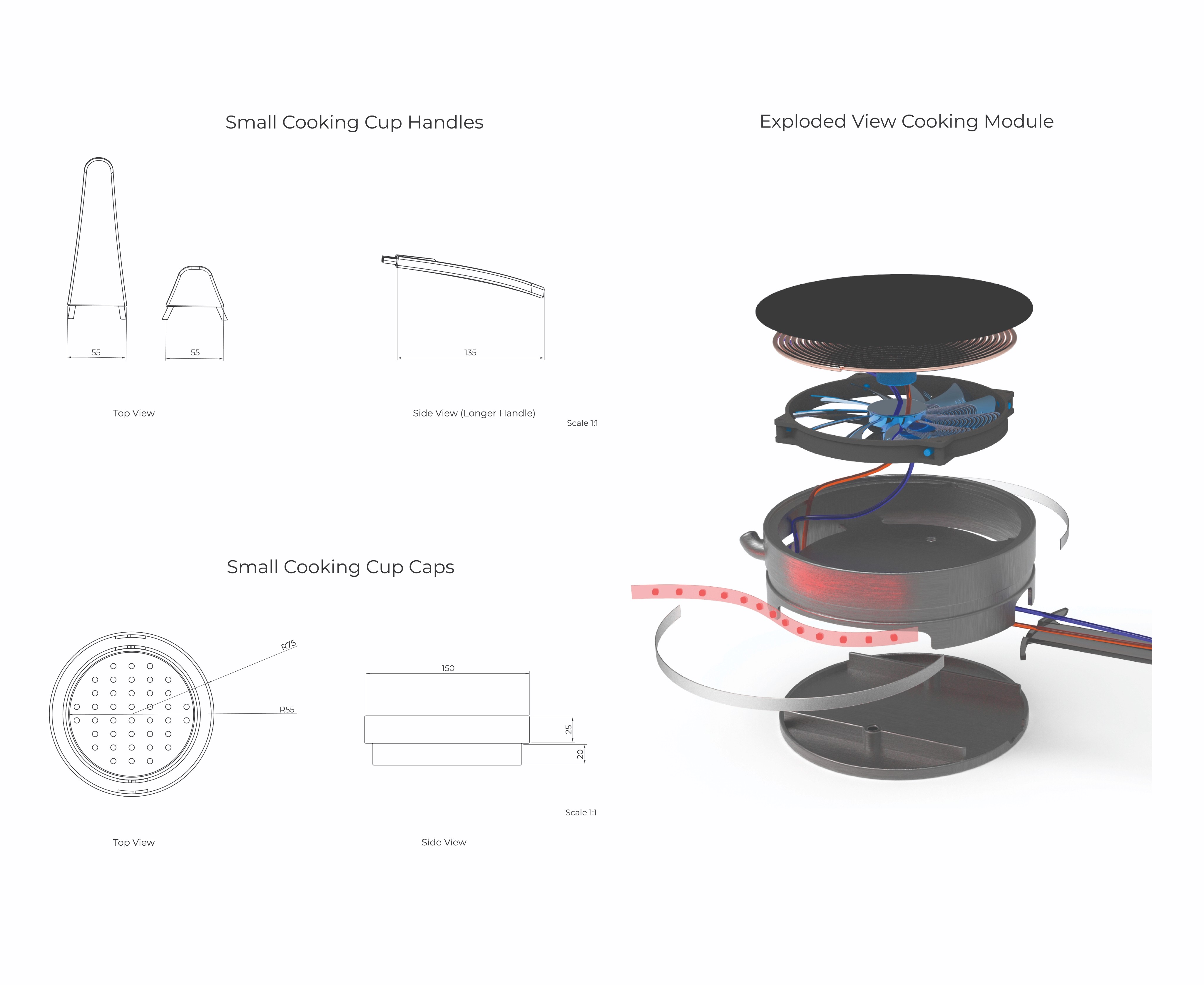 The modules are divided in two sections: one for the connectors and one for the electrical parts. Hence user need not to open the whole product for repairing. Handles can also be repaired individually. Cups are stackable for storing in limited cabinets at dorms.