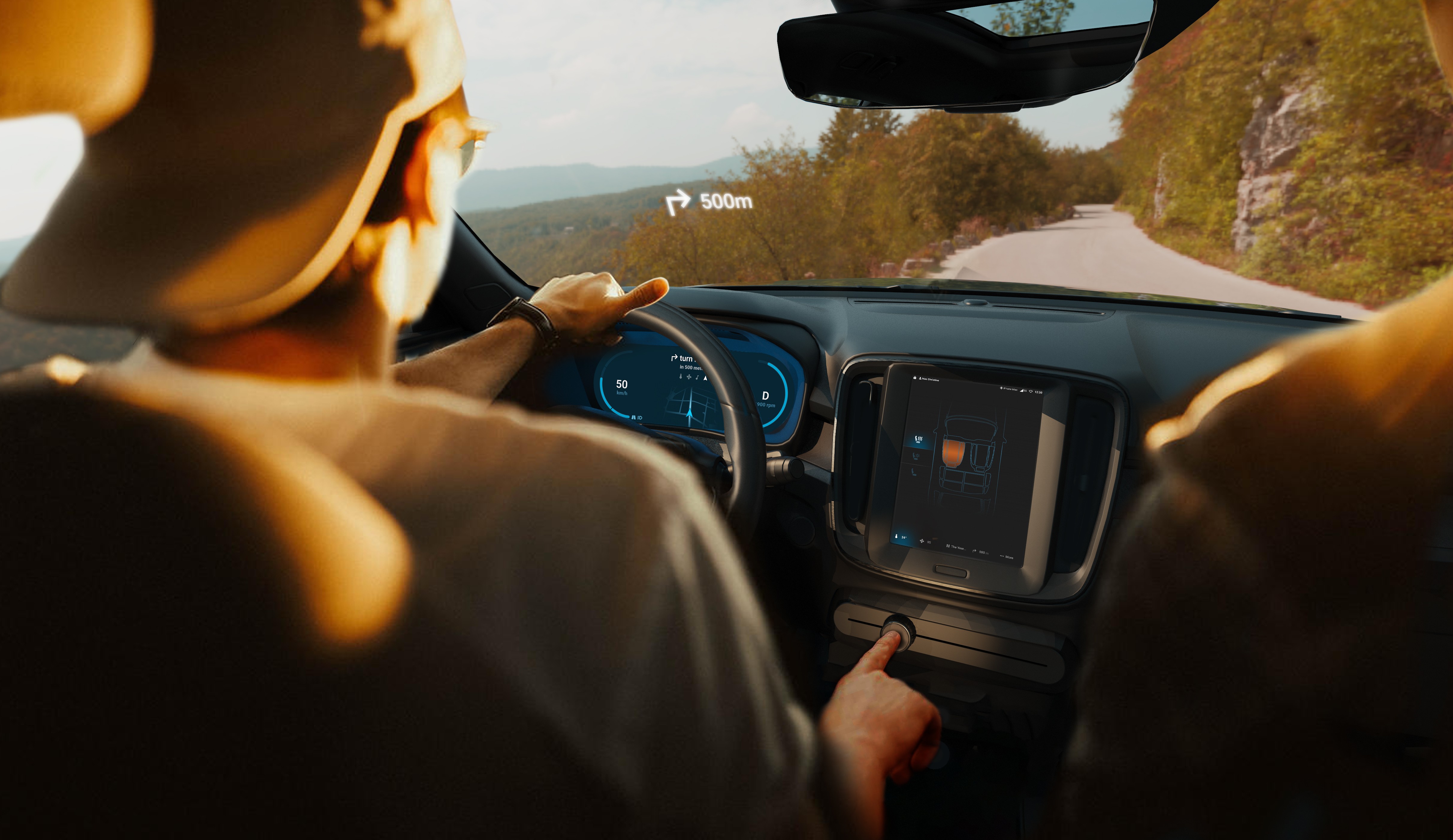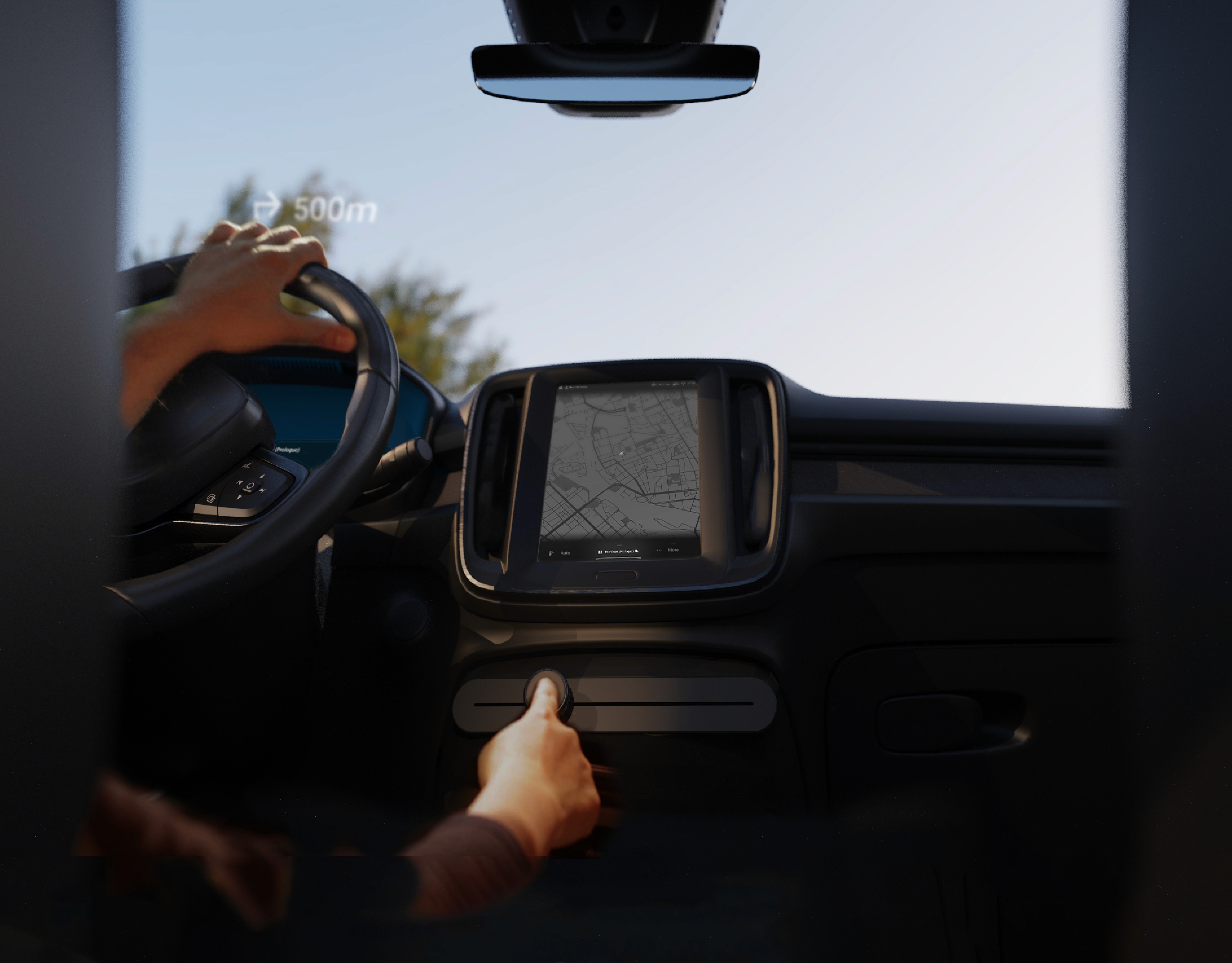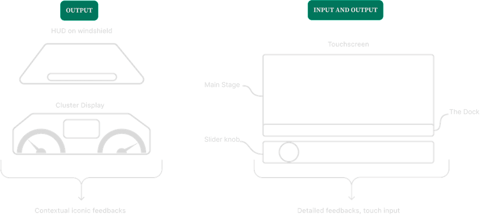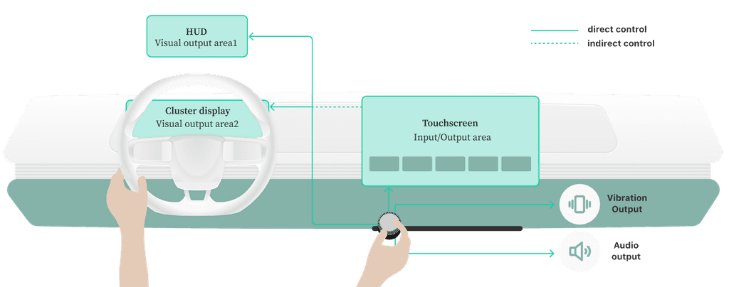 Horizon is an interactive system consisting of digital and physical controls for secondary infotainment system. The digital aspects contain the cluster display, the centre stack display and the HUD display. Whereas, the physical control is the slider knob.
