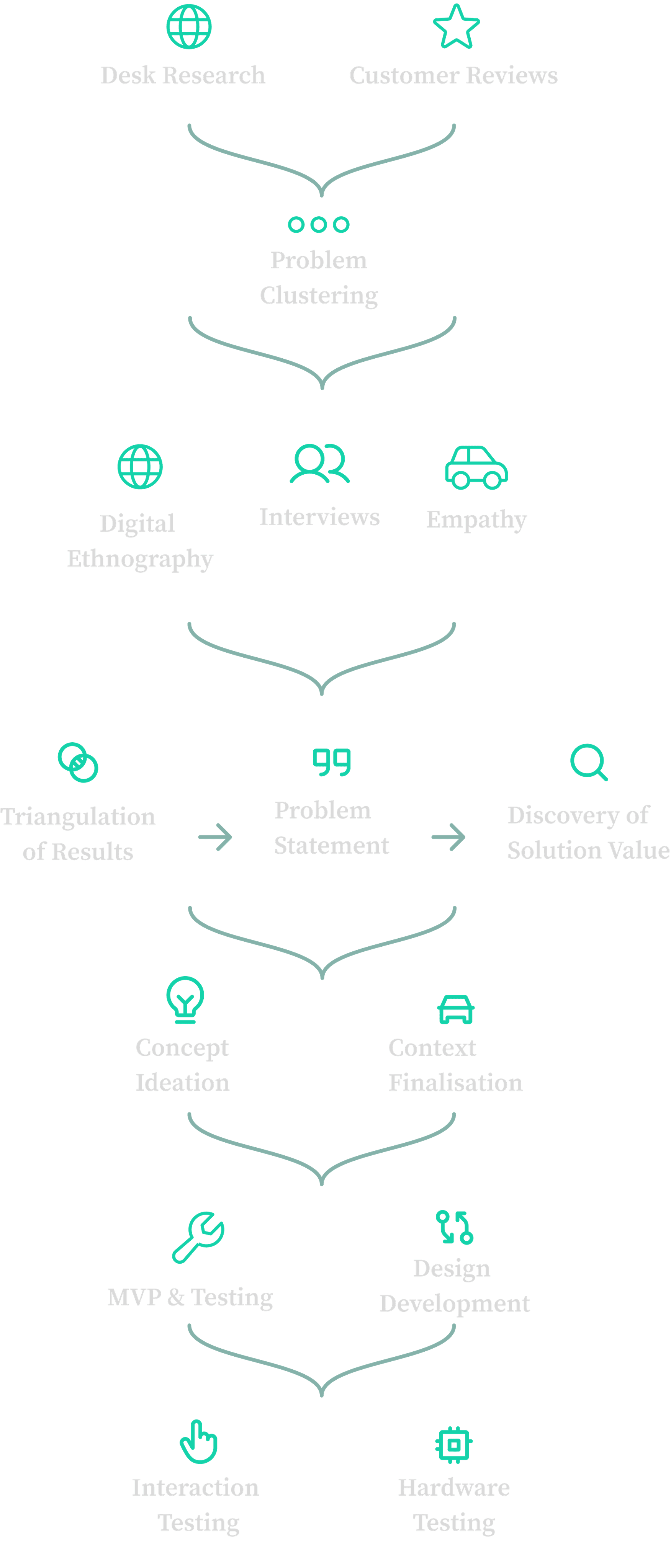 A convergent mixed with divergent process so far where we have been able to identify user needs, pains and values required to to address these in our proposed solution.