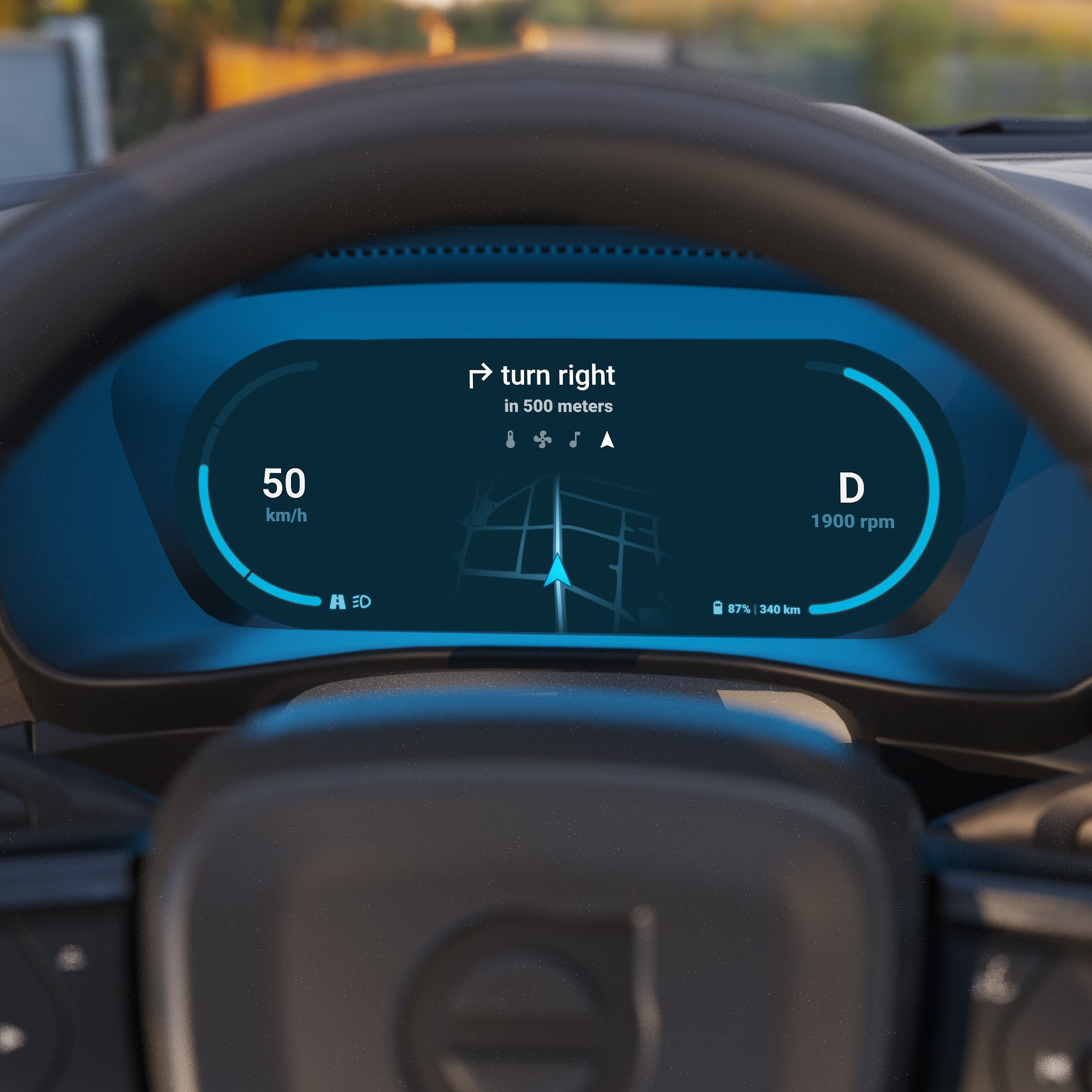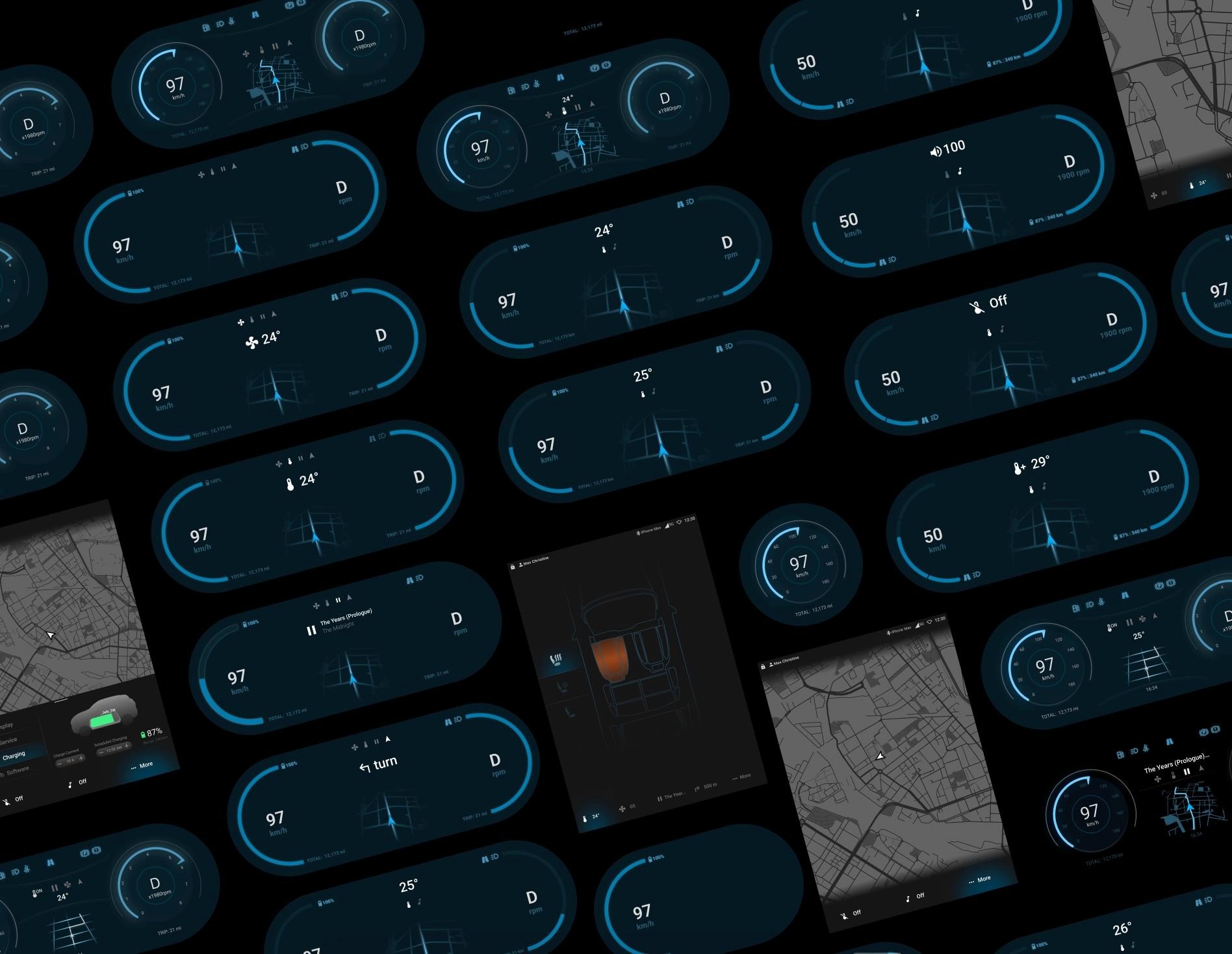 With tested hypothesis of placement and context we designed the interface of cluster screen, centre stack display and HUD with the aim of providing clear and minimal instructions to the driver to maintain focus on road.