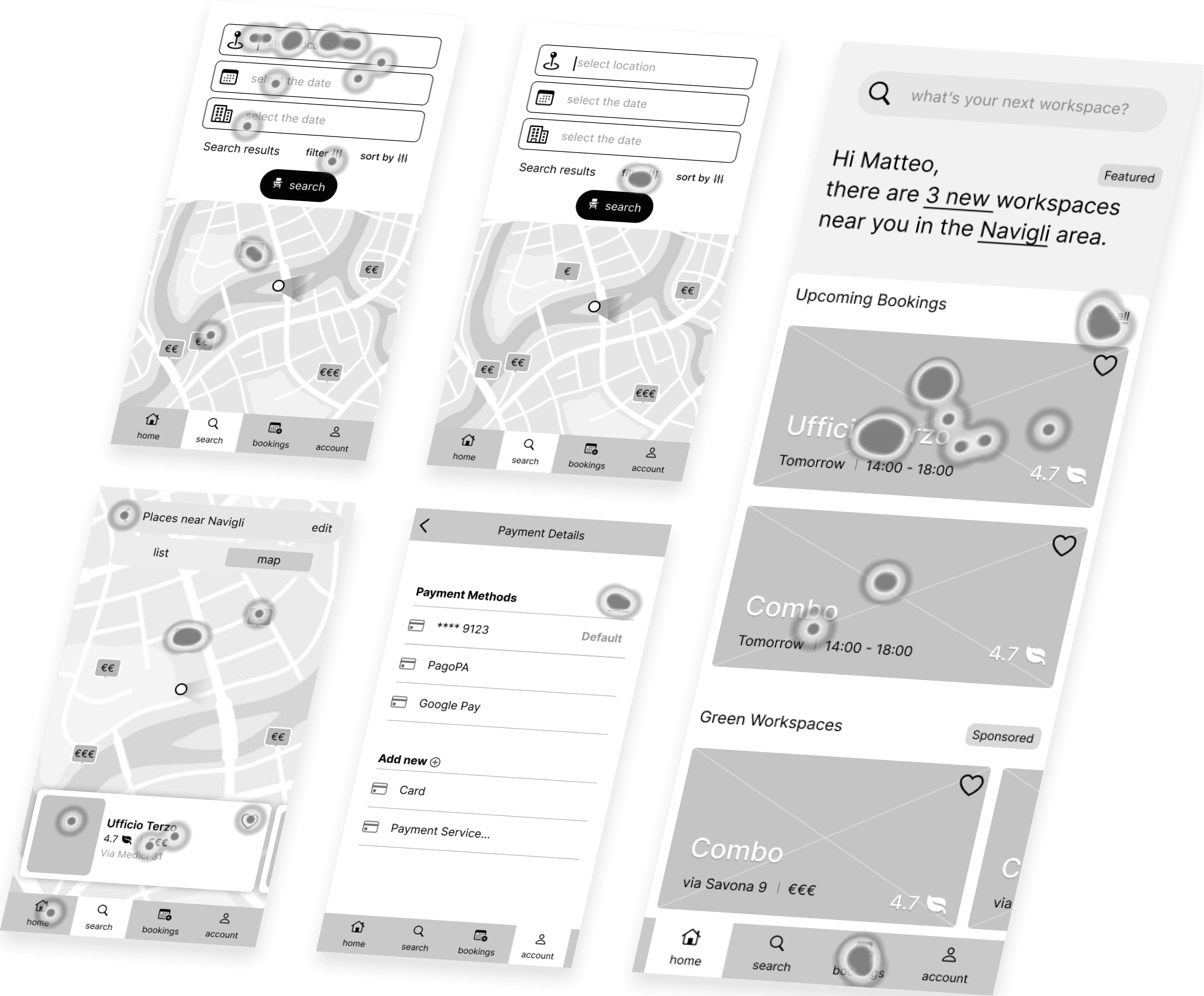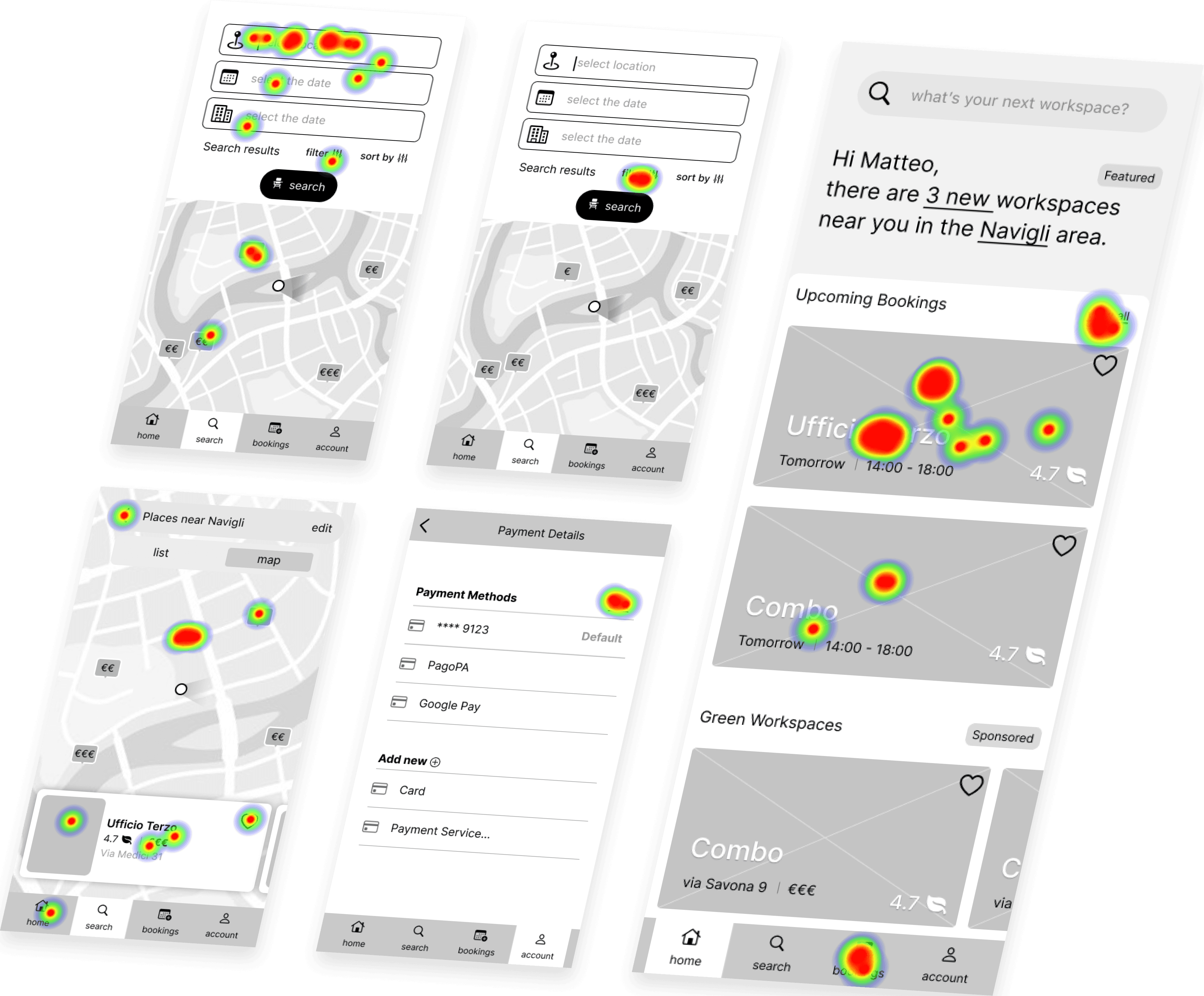 Used heatmaps for a number of tasks to evaluate the user experience. We were able to review user flows for each task and evaluate where the frictions existed. Moving forward, the next set of wireframes focused on limiting these frictions in interactions.